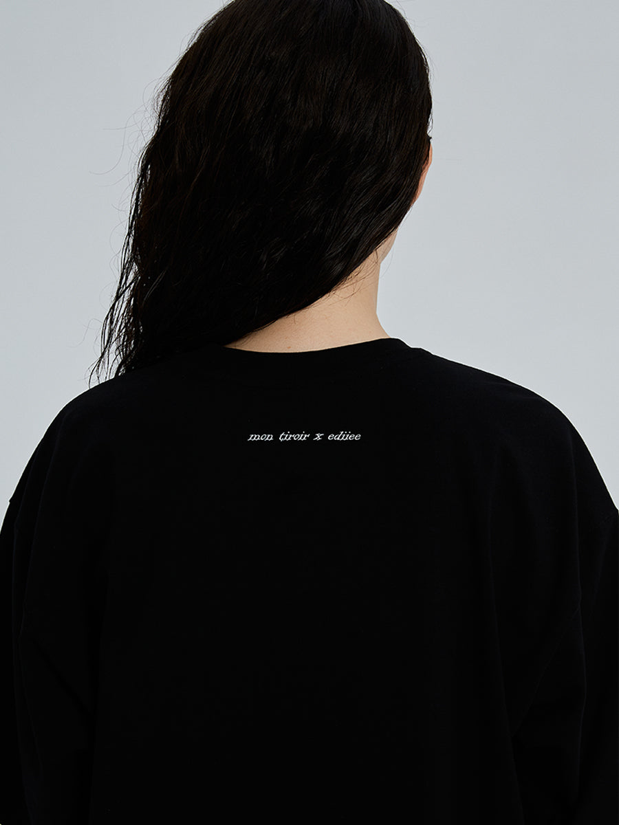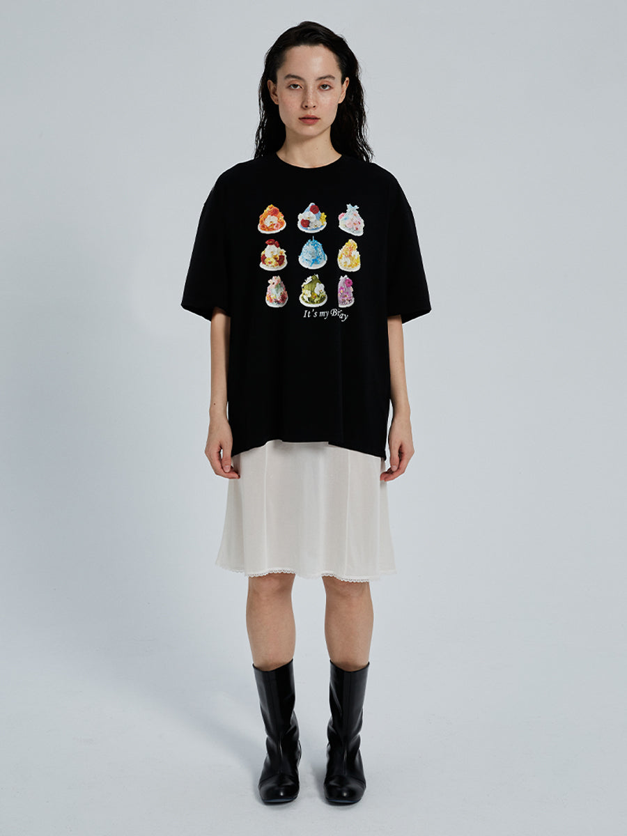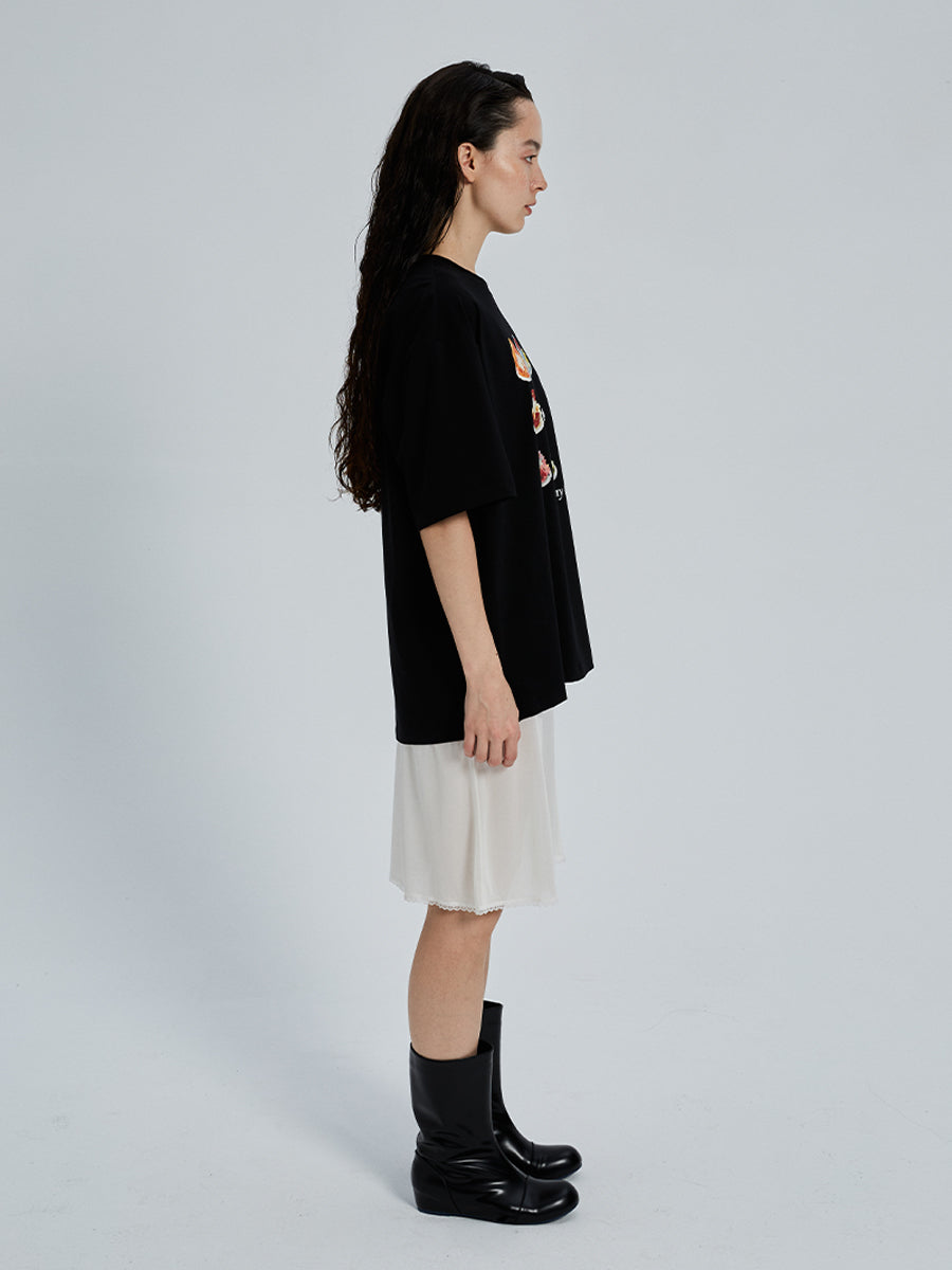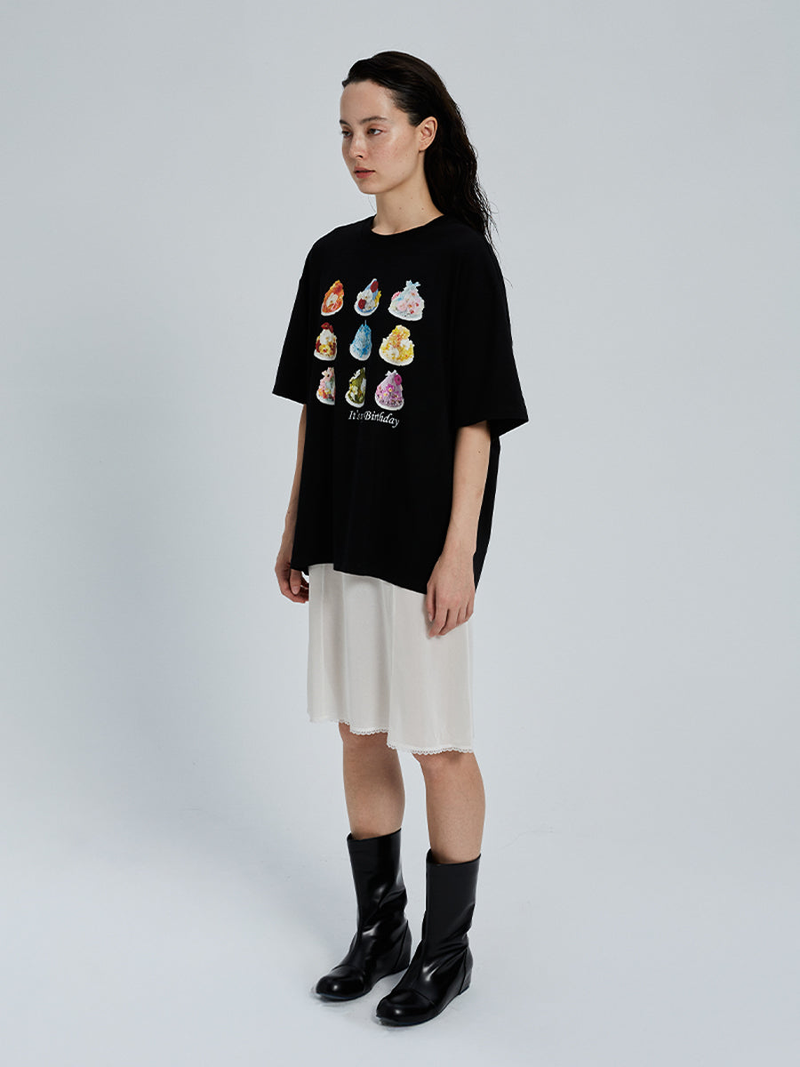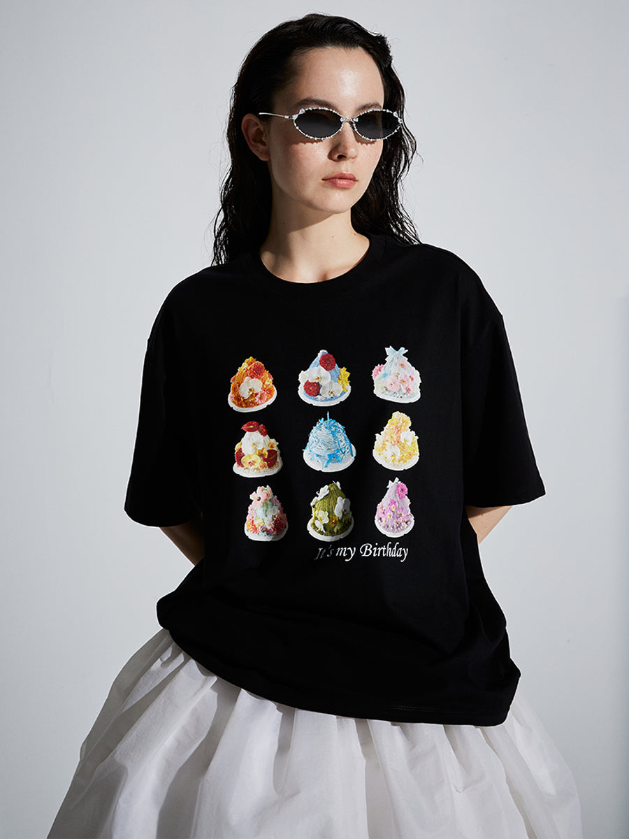 Loose cotton-blend tee in classic black, featuring a joyful cupcake print designed in collaboration with Shanghai cake artist Ediiee.