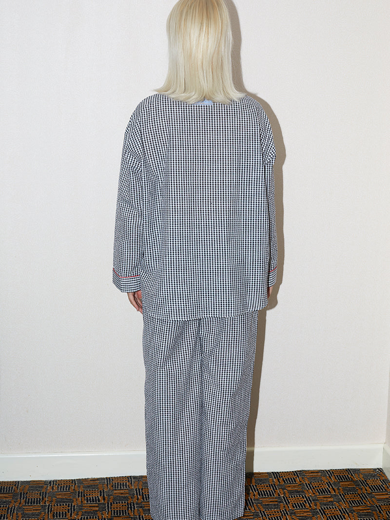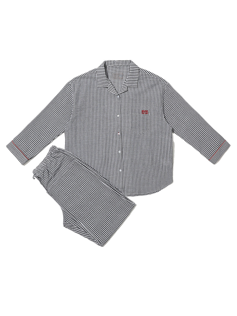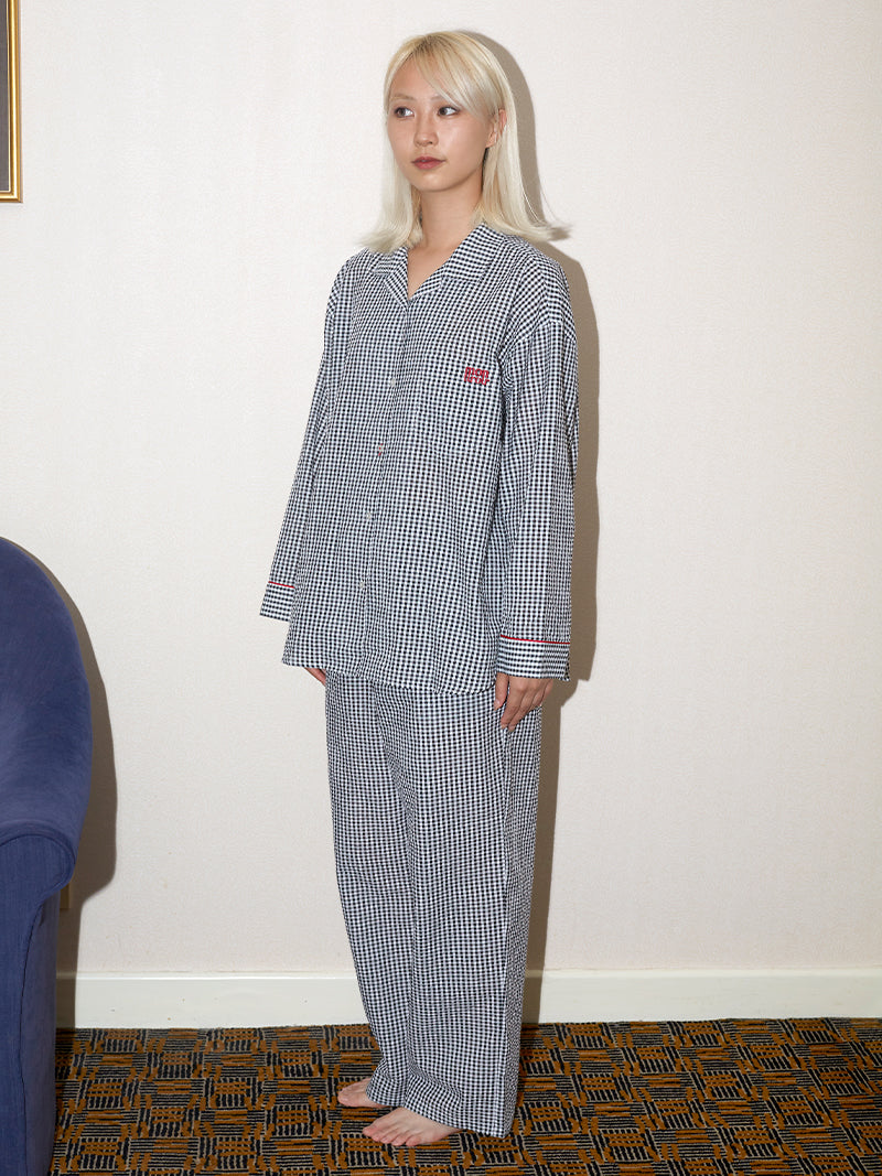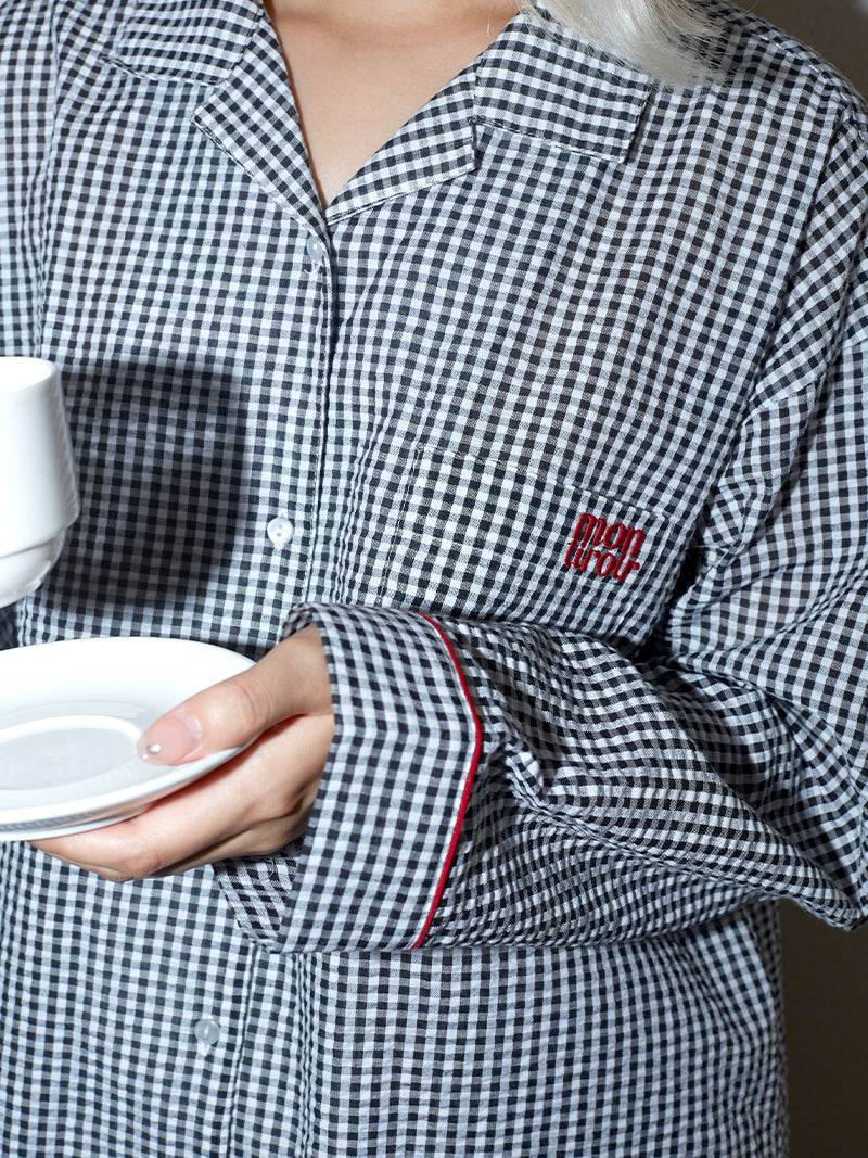 Long-sleeved shirt with front pocket embroidered with mon tiroir logo, paired with full-length drawstring pants for relaxed lounging.
