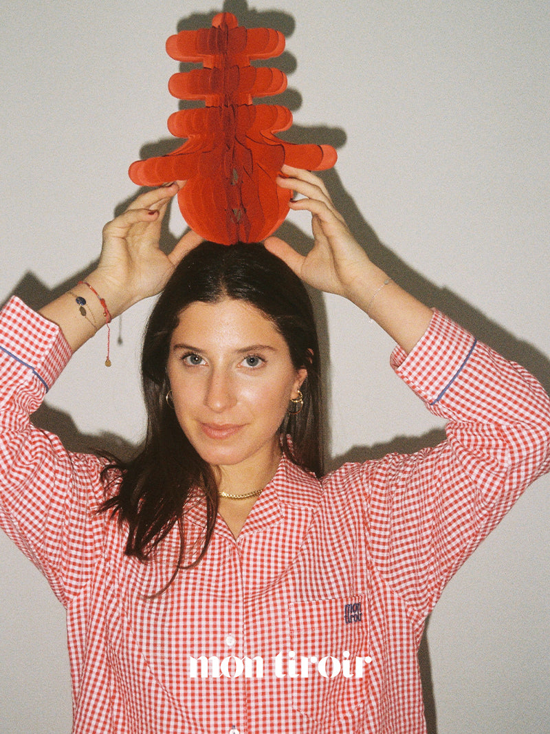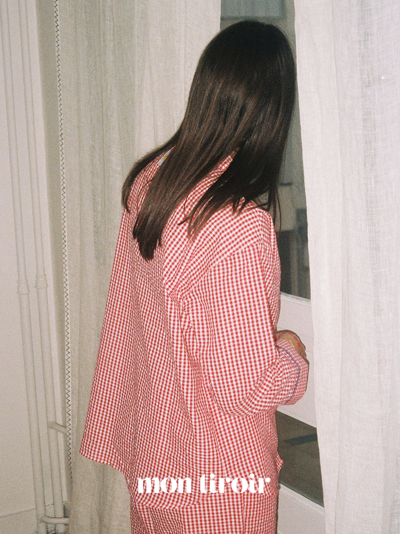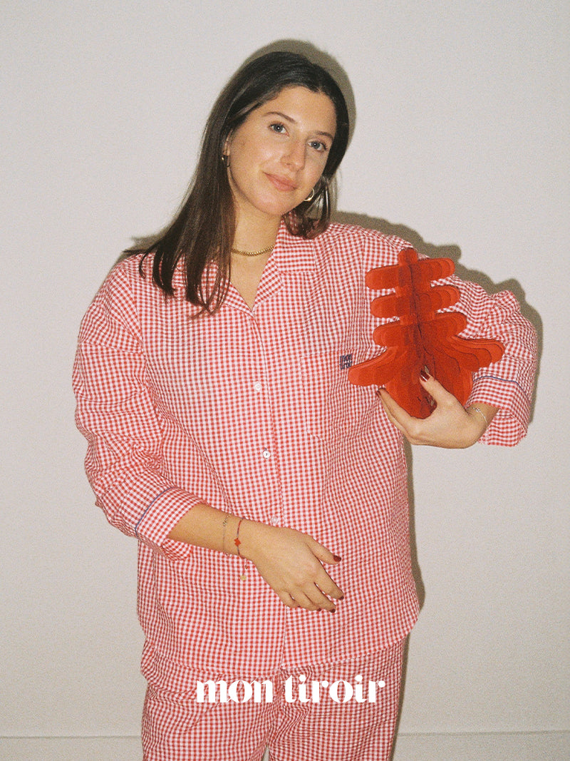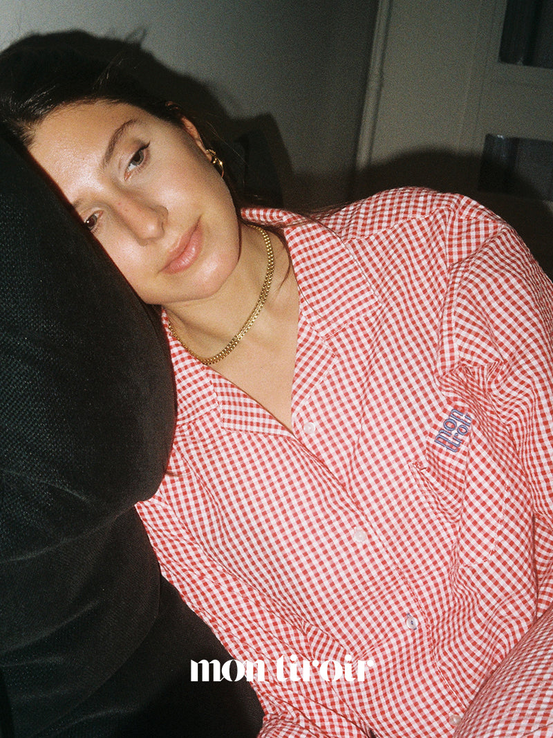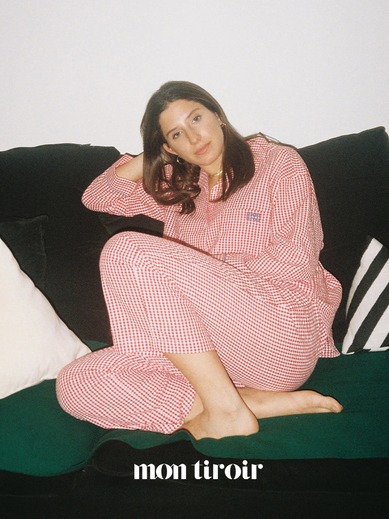 Long-sleeved shirt with front pocket embroidered with mon tiroir logo, paired with full-length drawstring pants for relaxed lounging.