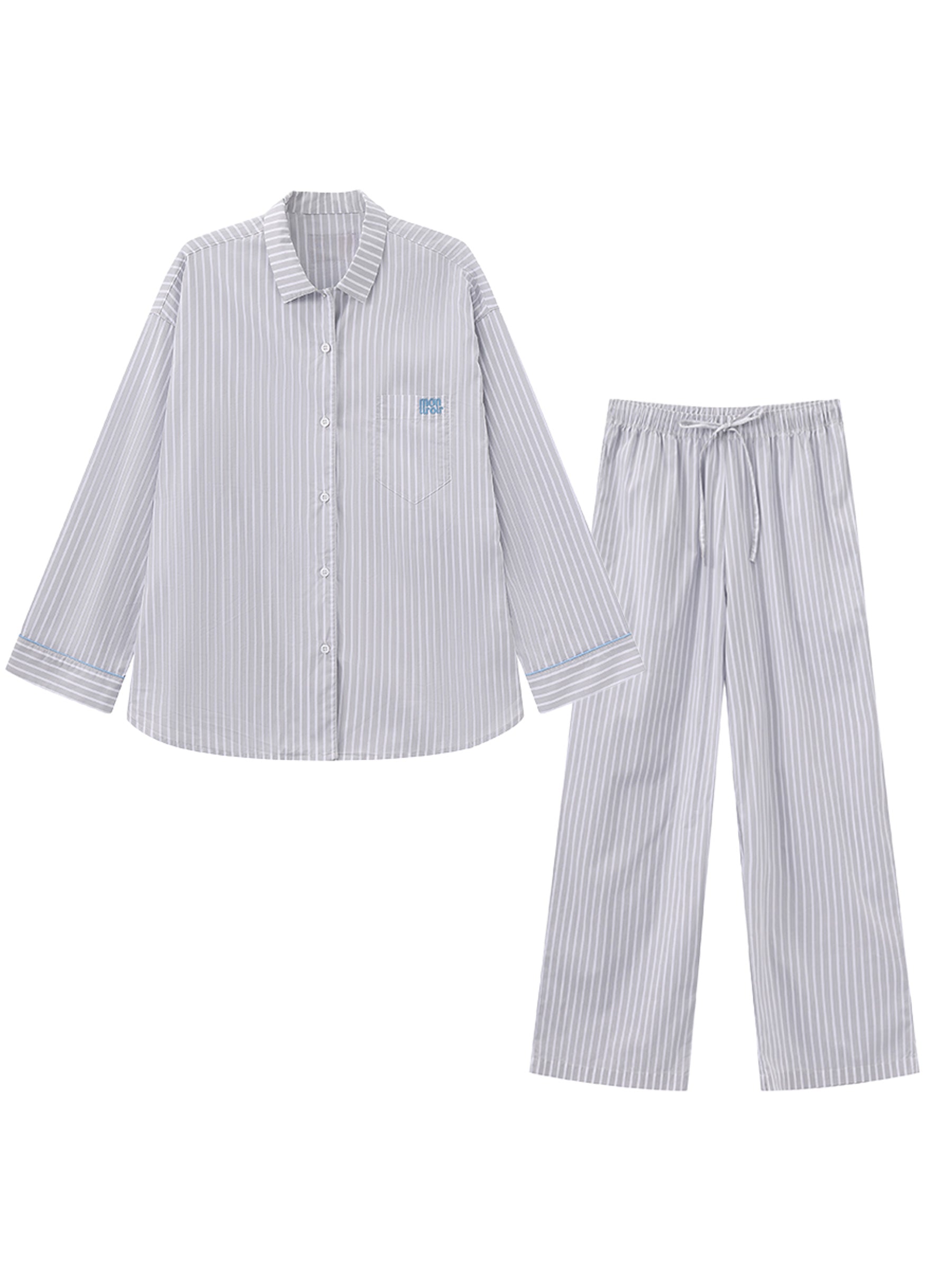 Crafted from a soft, breathable cotton-blend fabric, it is gentle on the skin while offering better wrinkle resistance than pure cotton. The set includes a long-sleeved button-down shirt with a mon tiroir logo-embroidered chest pocket, paired with full-length pants for effortless lounging.